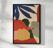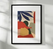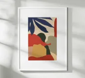 An abstract composition of leaf and plant forms in a warm palette of red, ochre, and dark blue against a neutral background. The style is modern and inspired by Maraoui.