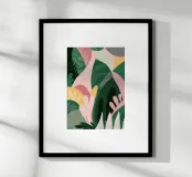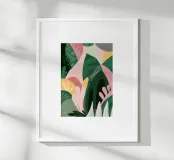 An elegant abstract artwork features overlapping leaves and organic shapes in a sophisticated palette of green, pink, and white, creating a modern and graceful botanical composition.