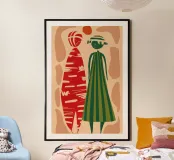 An abstract illustration of two stylized figures wearing boldly patterned red and green clothes, their forms simplified and elegant.