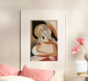 This artwork depicts an abstract figure in a seated pose, surrounded by geometric shapes and muted colors. The use of beige, brown, and black tones creates a sense of depth and complexity. The figure's posture and the abstract elements within the composition invite the viewer to reflect on the meaning and emotions conveyed by the artwork.