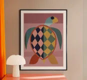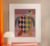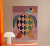 Abstract illustration of a turtle created with geometric shapes and a soft, modern color palette.