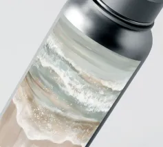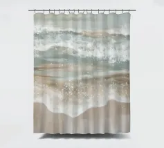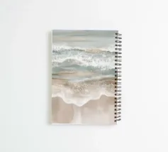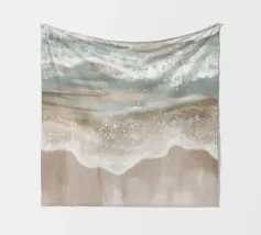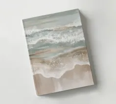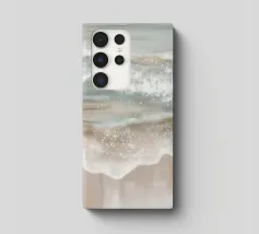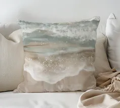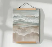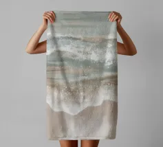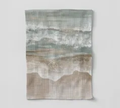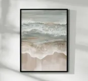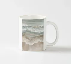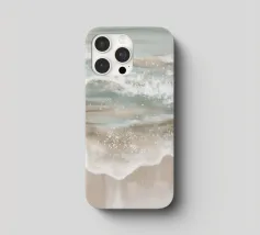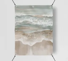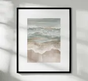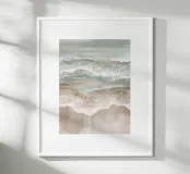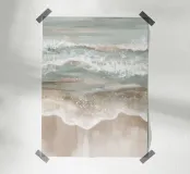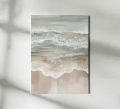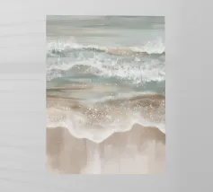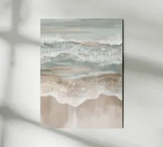 This maritime illustration shows a top view of the sea and the beach coast, with high waves and gentle surf. The soft pastel green and beige colours create a relaxing atmosphere reminiscent of summer travel and the beauty of nature. Ideal for lovers of coastal art and a summery mood.