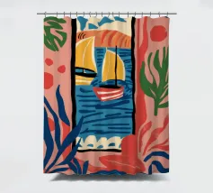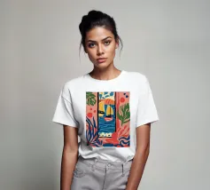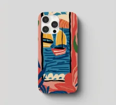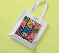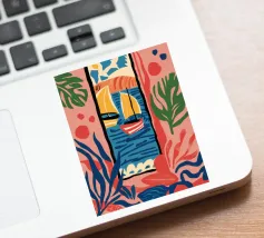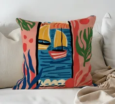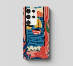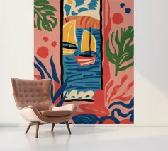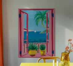A modern, abstract composition of a window view, with colorful shapes representing plants, a table, and the outdoors. The piece is a vibrant, artistic, and energetic interpretation of an interior scene.