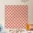 A repeating pattern features red and white geometric shapes on a soft pink background. Each shape resembles a half-circle stacked on a trapezoid, creating a cohesive and rhythmic design.