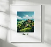 Travel poster depicting a Tuscan village perched atop green hills, surrounded by cypress trees and vines and bathed in southern light. A warm, authentic scene perfect for a Mediterranean, country-style wall decoration.