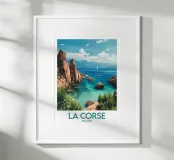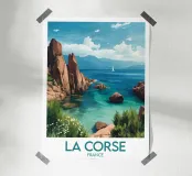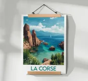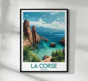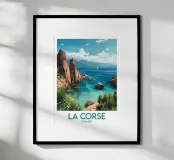 A vibrant illustration of the Corsican coastline, with its red rocks and turquoise sea. An ideal poster for a sunny, wild wall decoration.