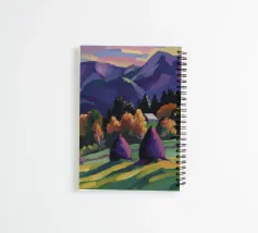 A mountain landscape painting showcases stylized haystacks in a field before a backdrop of majestic, sharply peaked mountains in blues and purples, under a dramatic, colorful sky.