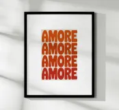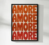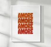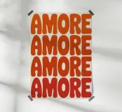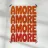 Abstract typography design with the lettering "AMORE" in bold, rounded letters in orange and red. The letters are lightly textured and placed in a staggered grid arrangement on light beige, creating a modern, eye-catching pattern.