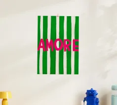 This print features the word "AMORE" in red lettering against a background of light and dark green stripes. A stylish work of art, ideal as a gift for lovers of modern decoration, romance and inspirational wall art - perfect for living rooms, offices and special occasions.