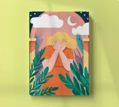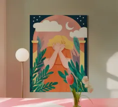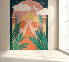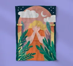 An illustration of a person holding a cloud in their hands, framed by an arched window against a starry night sky. The scene is magical, dreamlike, and full of gentle, imaginative wonder.