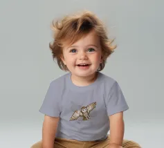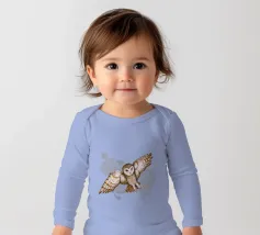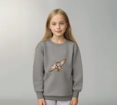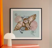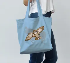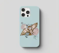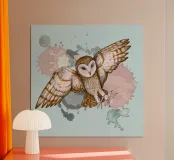 A wild watercolor drawing of a barn owl. The owl flies through the air in the attack position with its legs stretched out in front of it, ready to grab its prey. Image is digitally post-processed, with added dynamic background with drippings.