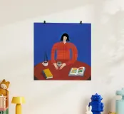 An illustration of a woman with red hair and glasses sitting at a table with an open book, another book, and a cup. Her checkered orange shirt and the blue background create a colorful and cozy scene of reading or studying.