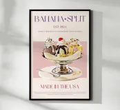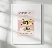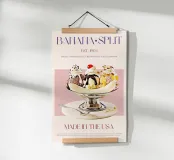 Set on a neutral, cream background, this elegant illustration of the famous banana split dessert adds sophistication to any kitchen, cafe or dining area. This minimalist yet informative design will spark conversation in any setting, adding a refined touch to your environment.