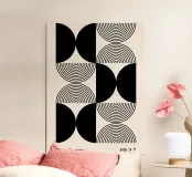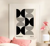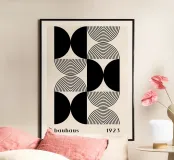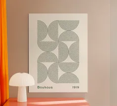 This minimalist Bauhaus design from 1923 combines circular and geometric elements in a harmonious black and white pattern. The perfect symmetry of the semi-circles and concentric circles creates a timeless work of art that is ideal as a wall mural, on cushions or mugs. Especially for lovers of modern and abstract art, this design offers a stylish addition to your home or office. Bring Bauhaus art into your surroundings and experience timeless aesthetics.