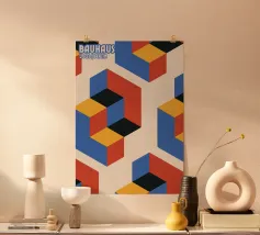 Product description: This dynamic design combines the powerful impact of geometric shapes with a vibrant colour palette of yellow, pink and blue. The cubic patterns appear to float three-dimensionally due to the contrasting arrangement and dark background colour, creating a hypnotic and modern look. The slogan "BE BOLD - From Another Point of View" emphasises the bold character of the design and invites you to take on new perspectives. Details: Design style: Modern, geometric and visually appealing. Colour palette: Bold primary colours.