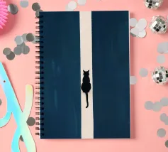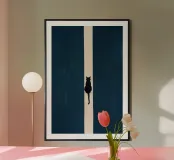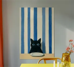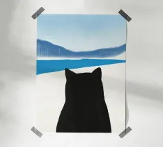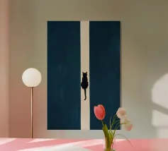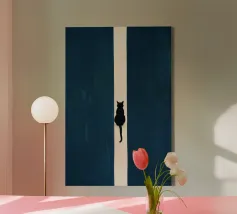 This minimalist composition explores solitude and direction through stark geometry and restrained symbolism. A solitary black cat is reduced to a near-silhouette, centered precisely along a vertical band of light that divides a deep, textured field of blue. The contrast between darkness and illumination becomes the primary narrative device, evoking themes of choice, transition, and quiet determination.