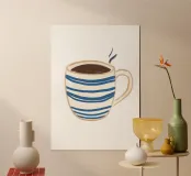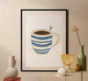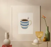 Brighten your kitchen or cafe with this charming wooden framed art print featuring a delightful watercolour coffee cup design. Perfect for coffee lovers, this artwork makes a unique gift for housewarmings or special occasions.