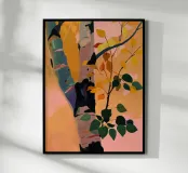 A minimalistic artwork of a single birch tree with colorful leaves, painted in bold, flat tones.