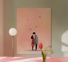 Explore the evocative 'Bittersweet' wooden framed art print by Dustlight Atelier, showcasing a modern, intimate couple illustration with bold orange and deep blue tones. Ideal for living room or bedroom decoration, this piece brings a contemporary romantic vibe to your home with sustainable wooden framing and high-quality print finish. Perfect as a unique gift for couples or a striking addition to modern wall art collections.