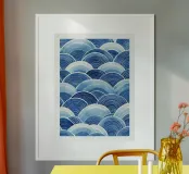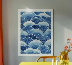 An elegant abstract pattern of blue waves unfolds in this illustration. The flowing curves and subtle gradations of blue create a soothing, rhythmic effect, bringing a touch of harmony and freshness to your space. This timeless design evokes the tranquillity of the sea, ideal for any room where you want to create a calm and serene atmosphere.