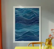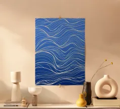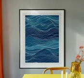 Cette illustration moderne représente des vagues fluides aux nuances de bleu allant du marine profond au bleu clair, créant un effet de mouvement apaisant. Les lignes blanches fines contrastent parfaitement avec les dégradés de bleu, apportant une sensation de tranquillité et de fraîcheur à votre espace. Parfait pour ajouter une touche contemporaine et aquatique à votre décoration murale.