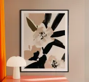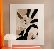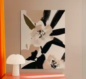 A dynamic floral composition featuring soft blush petals contrasted with bold black strokes and deep olive leaves. The expressive brushwork and graphic contrasts make this piece an elegant yet striking complement to modern, minimalist, or monochrome-inspired spaces.