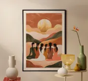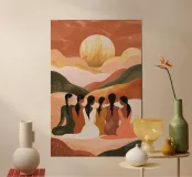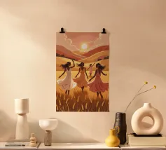 A warm, bohemian-style artwork capturing the essence of sisterhood and unity. A group of women sits together on rolling desert hills, their backs turned to the viewer as they gaze at a luminous golden sun. Their braided hair and flowing garments reflect a harmonious blend of earthy tones, including deep greens, soft peaches, and warm ochres. The landscape undulates with soft pastel hues, creating a dreamy, surreal ambiance. This piece evokes themes of connection, femininity, and tranquility, celebrating the quiet beauty of togetherness in a serene, sunlit setting.
