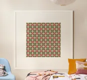 A seamless pattern featuring red and green floral motifs arranged diagonally on a light background. The design is symmetrical, creating a harmonious and repeating geometric structure.