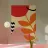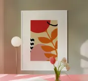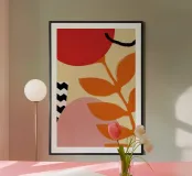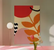 A bold and graphic botanical composition features a large, stylized orange red leaf branch against a background of abstract shapes, creating a powerful and modern statement.
