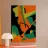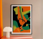 A powerful abstract artwork combines bold, sharp shapes in black, green, and orange, creating a dynamic, high-contrast, and edgy piece of modern art.