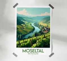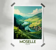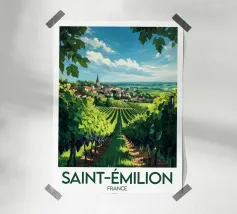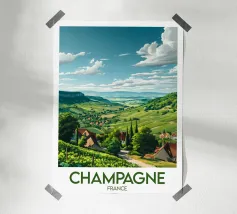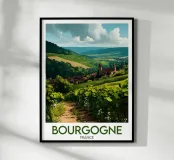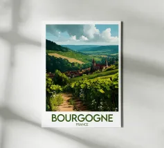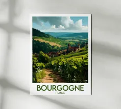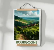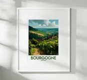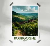 Let yourself be enchanted by Burgundy's wine-growing landscapes with this elegant poster. Rolling vines, a bucolic path and a typical village in the heart of a generous natural setting.
