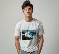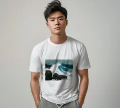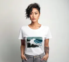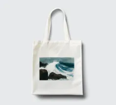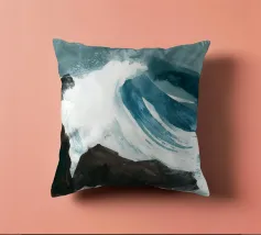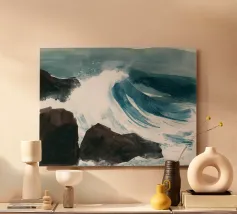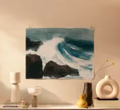 Expressive watercolor seascape capturing the raw motion of waves crashing against dark coastal rocks. Bold brushwork and deep ocean tones convey the drama and power of the sea.