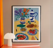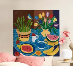 A vibrant still-life of a breakfast table with a blue patterned pitcher holding flowers, bread, fruits, and coffee, set against a yellow background. The style is colorful, illustrative, and cheerful.