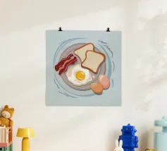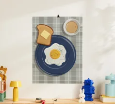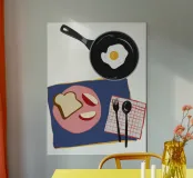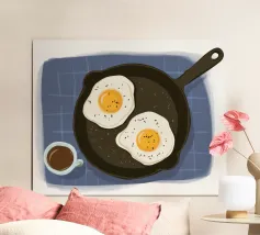 A graphic, top down view of deconstructed breakfast items on a gridded background, including toast, a fried egg in a pan, and utensils.