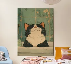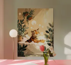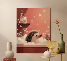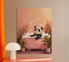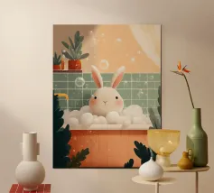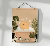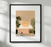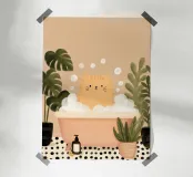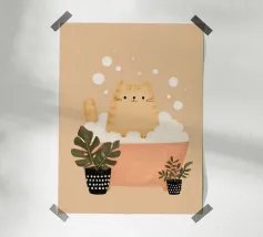 A charming illustration of a sweet orange tabby enjoying a relaxing bubble bath. The cat peeks out from a vintage-style bathtub filled with fluffy white foam, surrounded by soft floating bubbles that create a playful and calming atmosphere. Its simple whiskers, tiny smile, and warm golden fur give the artwork a gentle, comforting feel.