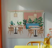A stylish interior of a modern cafe with pink walls, a large blue sofa, lush green houseplants, and simple wooden tables. The scene is bright, inviting, and perfectly captures a chic, contemporary urban oasis.