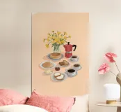 A spring table with daffodils, coffee, bread, and cups glows softly with pastel tones.