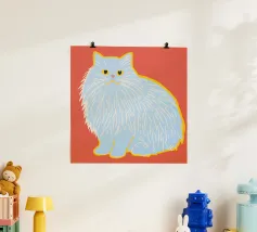 A stylized portrait of a calico cat with distinct green and orange patches on its white fur. The cat has a gentle expression and is set against a bold red background, highlighting its unique coat.
