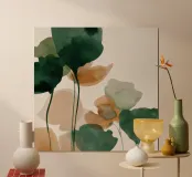 A soft, atmospheric watercolor piece featuring abstract foliage in deep forest greens, warm ochres, and muted earth tones. The gentle layering and translucency evoke the feeling of looking up through a tranquil forest canopy — perfect for serene, nature-inspired spaces.