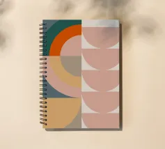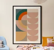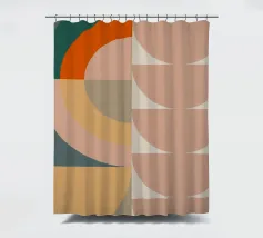 "Fall" is a modern abstract composition that harmoniously blends organic and geometric forms with a warm, autumnal palette. The left side features large, sweeping curves in burnt orange, deep teal, and ochre, evoking natural elements like changing leaves and a setting sun. This is balanced by the right side's clean, rhythmic pattern of four stacked semi-circles in a soft, dusty rose. The interplay between the flowing arcs and the structured repetition, all unified by a peaceful, earthy color scheme, creates a serene and contemporary visual ode to the quiet beauty of the season.