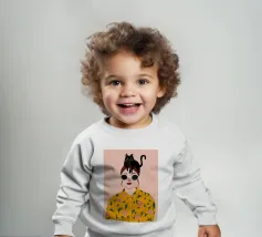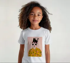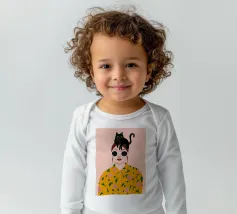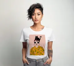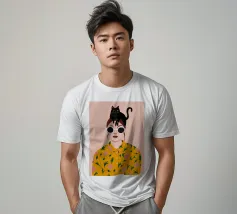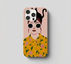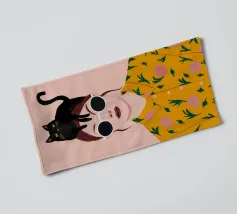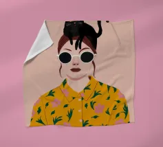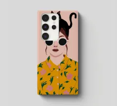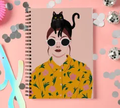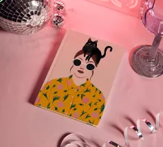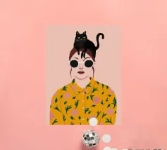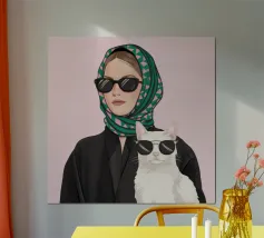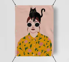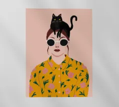A portrait of a stylish woman in sunglasses, with a small black cat perched on her head like a hat. The composition is a fun, chic, and whimsical statement on fashion and the love of cats.