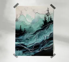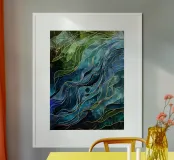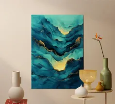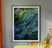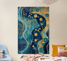 A mesmerizing abstract artwork featuring swirling, vibrant hues of blue, green, and gold. The intricate lines and patterns evoke a sense of cosmic depth and ethereal beauty. This piece is perfect for adding a touch of elegance and sophistication to any space.