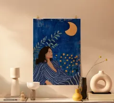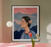 A serene profile portrait of a woman with dark hair, a white flower accent, wearing a blue dotted dress, set against a dreamy pink sky with scattered golden dots.