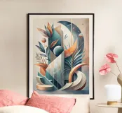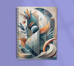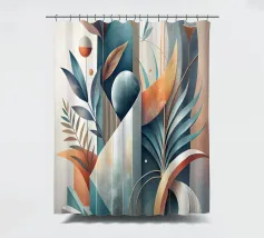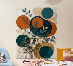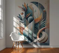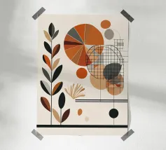 A captivating abstract artwork that blends organic and geometric elements. Lush foliage intertwines with celestial bodies and architectural forms, creating a sense of harmony and balance. The muted color palette and intricate details invite contemplation and exploration.