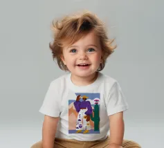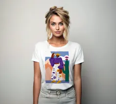 A modern, abstract portrait of a person in vibrant purple, patterned pants, holding a piece of fruit, their form deconstructed into bold shapes against a simple background.