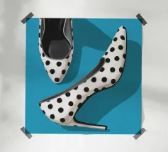 A close up, low angle view of a person legs and feet wearing stylish high heeled shoes. The shoes are uniquely decorated with a blue sky and white cloud pattern, creating a whimsical and fashionable statement.