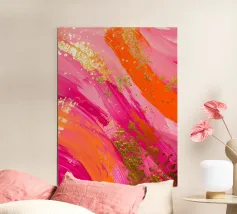 This vibrant abstract painting features a dazzling interplay of reds, purples, and gold, evoking a sense of cosmic energy and celestial beauty.