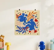 A dynamic composition inspired by Maraoui cutouts, featuring abstract blue figures dancing amongst orange and red botanical shapes, celebrating the joy of movement and the human form.