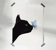 A quiet moment of wonder captured in motion. Chasing Light portrays a small black kitten suspended between earth and sky, reaching toward a fleeting blue butterfly. Set against a warm, golden background, the scene evokes innocence, curiosity, and the universal desire to touch something just beyond reach. The textured brushwork and gentle contrast between dark fur and radiant light create a sense of softness and emotional warmth. This artwork balances playfulness with poetic stillness, making it a charming yet thoughtful piece that invites reflection and joy.