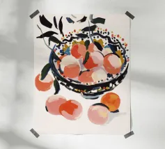 This minimalist illustration shows a blue fruit bowl full of healthy apples on a stylish tablecloth with a chequered pattern. The soft pink-lilac, orange and beige colours add a fresh touch to the artwork. Perfect for the kitchen, this fruit graphic promotes healthy eating and combines aesthetics with indulgence.